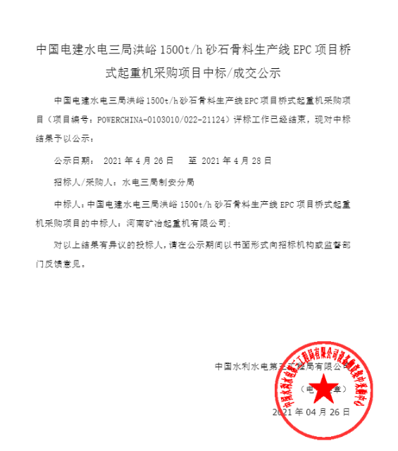 移动版:云南:【设备类】中国电建水电三局洪峪1500t/h砂石骨料生产线EPC项目桥式起重机采购项目成交公示