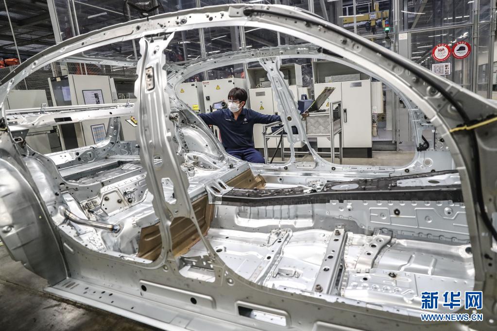 在沈阳华晨宝马大东工厂,工人在生产线上装配汽车(2018年5月23日摄)。新华社记者 潘昱龙 摄