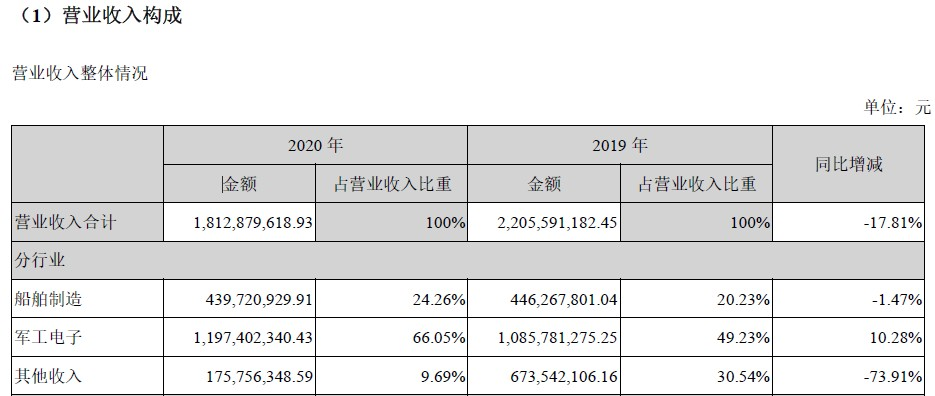 根据2020年年报,亚光科技的船舶制造收入仅占总营业收入的20%。