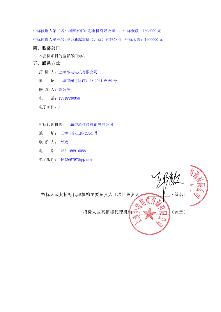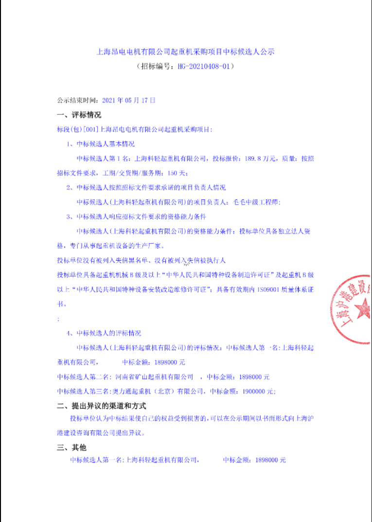 移动版:上海:昂电电机有限公司起重机采购项目中标候选人公示_