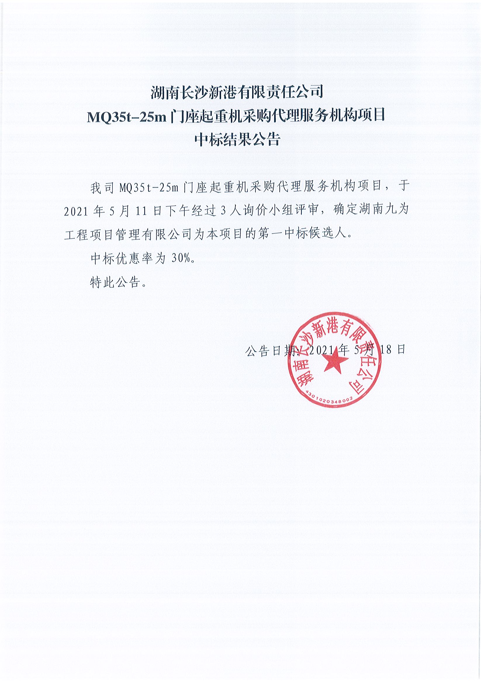 招标公司受业主委托,于2021-05-18在网上发布:湖南长沙新港有限责任公司MQ35t-25m门座起重机采购代理服务机构项目中标结果公告。各有关单位请与公告中招标负责人接洽联系,及时开展投标及相关工作,以免错失商业机会。