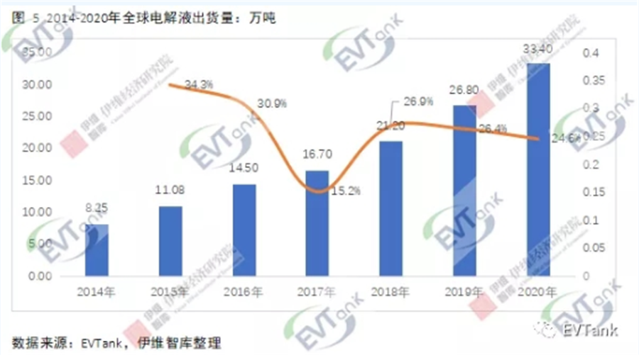 2020年全球锂离子电池电解液出货量达到33.4万吨 行业再次进入价量齐升阶段