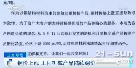 根据各家企业发布的产品调价通知函,中联重科、徐工机械分别自5月17日、6月1日起,执行发货的塔机和升降机全系列产品按照产品钢材净重,价格上调1000元/吨。山东临工装载机价格按不同系统分别上调8000元/台到20000元/台。
