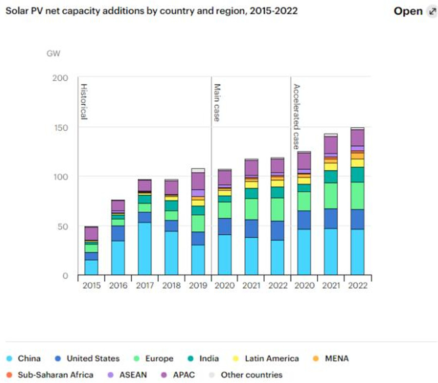 根据IEA的数据显示,虽然起步较晚,中国的太阳能发电装机量近年来发展迅速,光伏发电量快速增长。