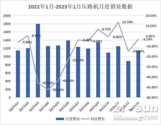 据中国工程机械工业协会对19家压路机制造企业统计,2023年1月当月销售各类压路机1142台,同比下降3.14%。