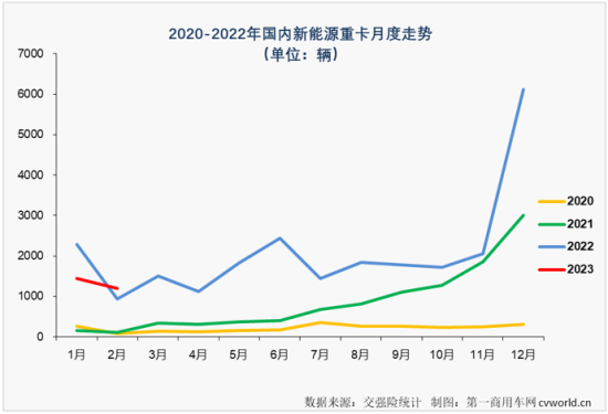 上图可见,代表2021年的绿色曲线几乎一向处于2020年的黄色曲线上方,代表2022年的蓝色曲线则从1月到12月一直处于2021年的绿色曲线上方。2023年,新能源重卡商场的发展“曲线”变得不同了,开端与上年曲线有了“相交”,这代表本年的新能源重卡商场不再只有“增加”一种声音,这也说明新能源重卡商场已经进入有涨有跌的老练阶段。上图还可见,本年前两个月新能源重卡商场销量所处的高度,放在2022年里看只能算是一个 “吊车尾”的方位, 因而,2月份新能源重卡销量虽完成同比增加,但要说商场就此复苏,或说商场已消化完上一年12月份透支的需求,显然还为时尚早。根据榜首商用车网把握的数据,本年前两个月,新能源重卡1月份同比降幅高于重卡商场全体降幅,2月份同比增幅却低于重卡商场全体增幅,可见提早透支对本年一季度新能源重卡商场的影响之大。
