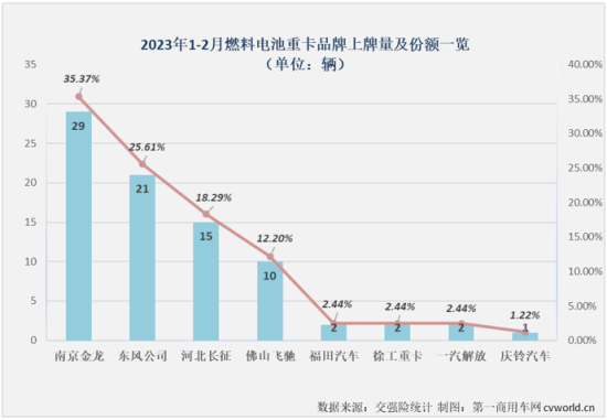 2022年全年,新能源重卡商场一共有19位累销超百辆“玩家”(2月往后到达9家);2023年前两个月,累计销量超百辆“玩家”已到达8家,尽管比上一年同期少一家,但仍然不会有人置疑本年新能源重卡累销超百辆的“沙龙”成员会少于上一年。