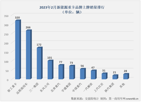 2023年2月份,新能源重卡商场持续有4家企业销量超百辆。徐工以320辆的体现连任月榜冠军,长途商用车、三一和春风三家企业别离以266辆、172辆和101辆排列2-4位。