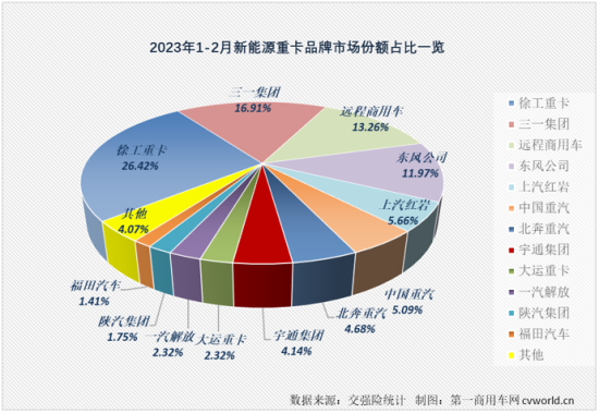 从商场比例看,2023年1-2月,徐工新能源重卡累销695辆暂列职业榜首,累计比例到达26.42%,较上年同期提高7.3个百分点;三一新能源重卡以16.91%的累计比例暂列第二位,较上年同期提高8.88个百分点;长途商用车和春风紧随其后排列3、4位,在2023年1-2月的新能源重卡商场别离抢到13.26%和11.97%的比例,是另外两家累计比例超越10%的企业,其间春风本年1-2月累计比例较上年同期提高了5.58个百分点。排名5-8位的上汽红岩、我国重汽、北奔重汽和宇通集团1-2月累计比例别离为5.66%、5.09%、4.68%和4.14%,以上也是本年1-2月新能源重卡累销超越百辆的职业TOP8企业。截止到2月份,新能源重卡商场相邻企业比例距离均不算大,多组“街坊”累计销量仅差几十辆、十几辆,现在并列第9的大运和解放销量乃至完全相同,2023年新能源重卡排位赛刚过两轮,大家都还有后发先至的机会。