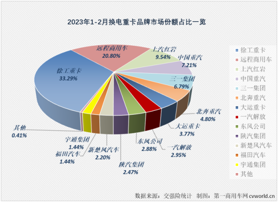 从商场比例看,2023年1-2月,徐工累计实销换电重卡485辆,以33.29%的累计比例暂列职业榜首;长途商用车位列次席,1-2月累计实销换电重卡303辆,累计比例为20.8%;上汽红岩以累计出售139辆的体现暂列第三位,累计比例为9.54%;我国重汽以累计出售105辆,7.21%的累计比例暂列第4位,以上也是现在换电重卡累计销量超越百辆的4家企业。三一、北奔和大运排列5-7位,2023年1-2月别离累销换电重卡99辆、70辆和55辆,累计比例别离为6.79%、4.8%和3.77%。