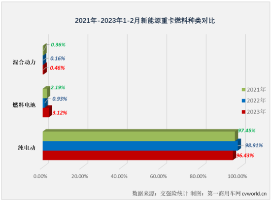 根据小编把握的数据,2022年新能源重卡技能道路以纯电动(包括换电式纯电动)为主,2022年全年,纯电动车型在新能源重卡销量结构中占比到达90.08%,新能源重卡以纯电动为主的技能道路这一特点也延续到2023年。2023年1-2月,燃料电池重卡和混合动力重卡合计在新能源重卡商场仅占到3.57%的比例,余下96.43%均为纯电动车型(但这一占比较前两年同期已有缩窄,如下图)。