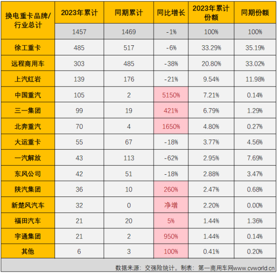 2023年1-2月,换电重卡累计实销1457辆,同比小降1%,远低于新能源重卡商场全体18%的降幅,持续跑赢新能源重卡商场“大盘”。