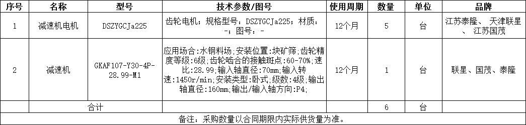 • 物料名称: 减速机电机 数量: 5 规格: DSZYGCJa225 长度: 宽度: 厚度: 材质: -