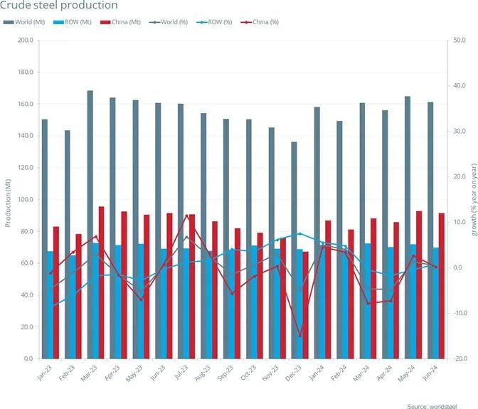 2024年6月全球71个纳入国际钢铁协会计算国家的粗钢产值为1.614亿吨,同比进步0.5%。