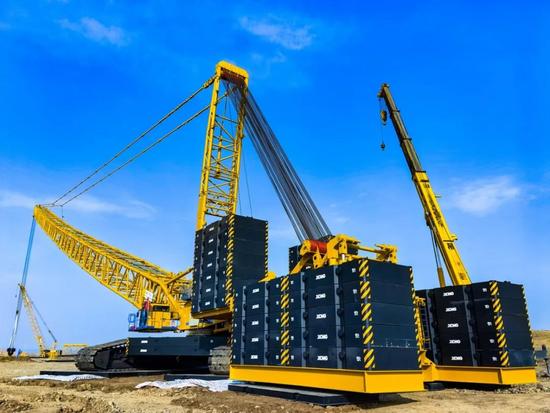 近日,徐工XLC18000M(1300吨级)型履带起重机在我国华北地区某大型风储基地成功完成了3台10MW超大型风电机组的吊装。