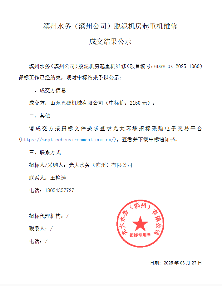 移动版:滨州水务(滨州公司)脱泥机房起重机维修成交结果公示