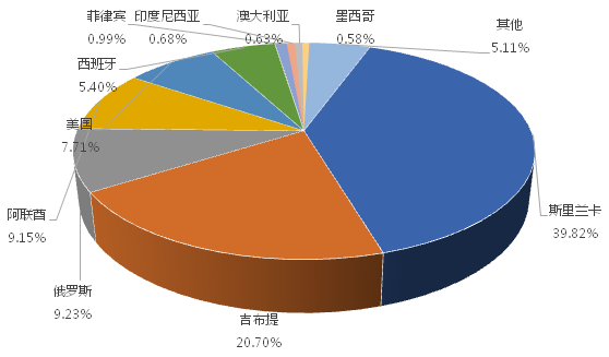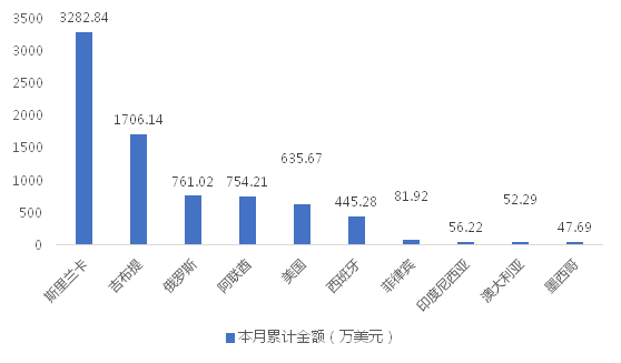 1-2月,我国龙门式起重机出口金额排名前十的国家/地区分别为斯里兰卡、吉布提、俄罗斯、阿联酋、美国、西班牙、菲律宾、印度尼西亚、澳大利亚、墨西哥,合计占我国该产品出口总额的94.91%。其中,向斯里兰卡出口最多,金额为3282.84万美元,占出口总额的39.82%。