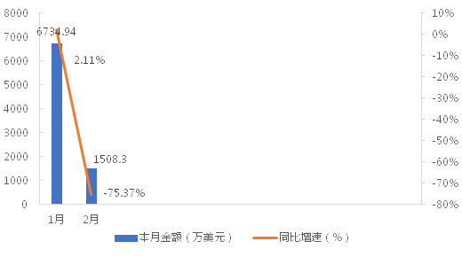 1-2月,我国龙门式起重机累计出口金额为8243.24万美元,同比下降35.20%;累计出口数量为613台,同比下降9.05%;出口均价为13.45万美元/台,同比下降28.72%。