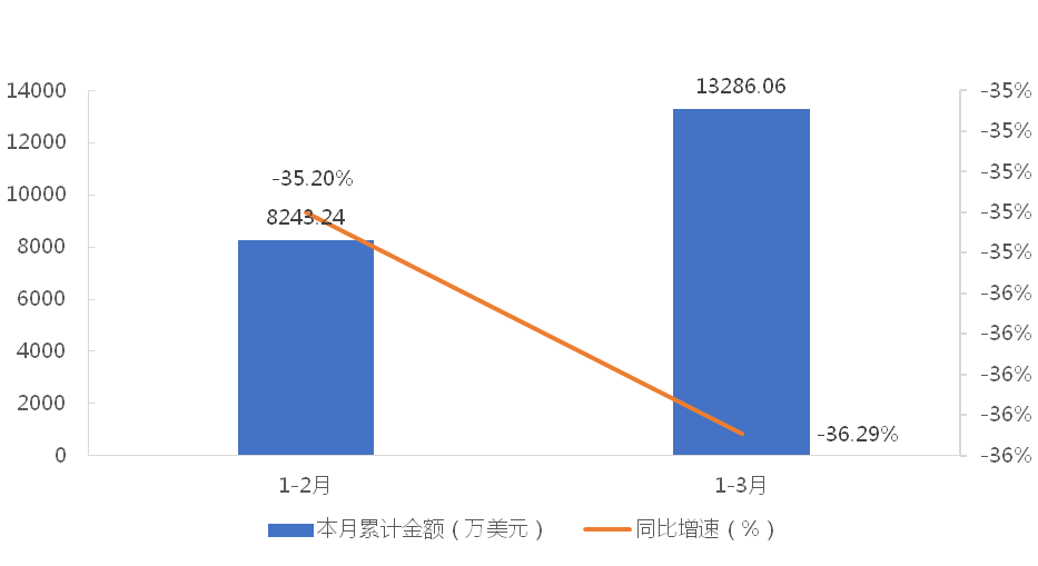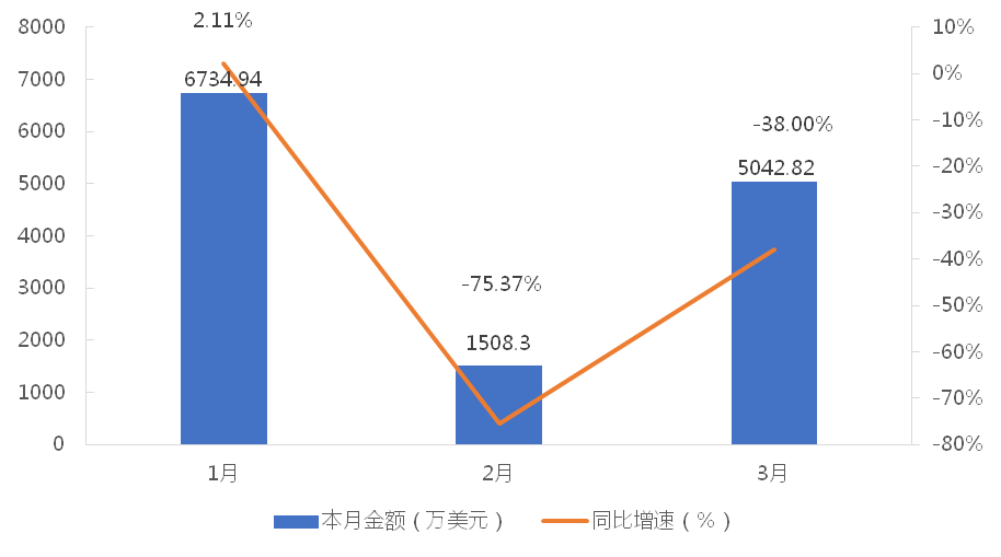 1-3月,我国龙门式起重机累计出口金额为13286.06万美元,同比下降36.29%;累计出口数量为974台,同比增长12.60%;出口均价为13.64万美元/台,同比下降43.43%。