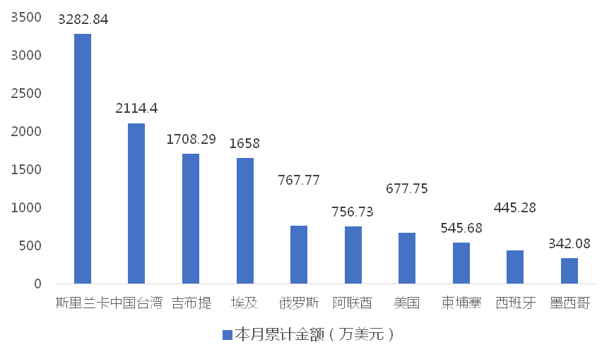 1-3月,我国龙门式起重机出口金额排名前十的国家/地区分别为斯里兰卡、中国台湾、吉布提、埃及、俄罗斯、阿联酋、美国、柬埔寨、西班牙、墨西哥,合计占我国该产品出口总额的92.57%。其中,向斯里兰卡出口最多,金额为3282.84万美元,占出口总额的24.71%。