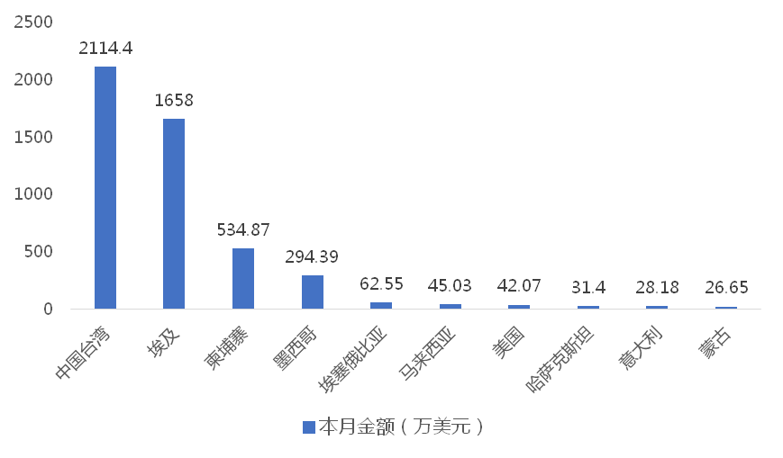 2025年3月,我国龙门式起重机出口金额排名前十位的国家/地区分别为中国台湾、埃及、柬埔寨、墨西哥、埃塞俄比亚、马来西亚、美国、哈萨克斯坦、意大利、蒙古,合计占我国该产品出口总额的95.93%。其中,向中国台湾出口最多,金额为2114.40万美元,占出口总额的41.93%。