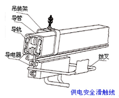 供电安全滑触线装置由导管,导电器两主要部件及一些辅助组件构成如图: