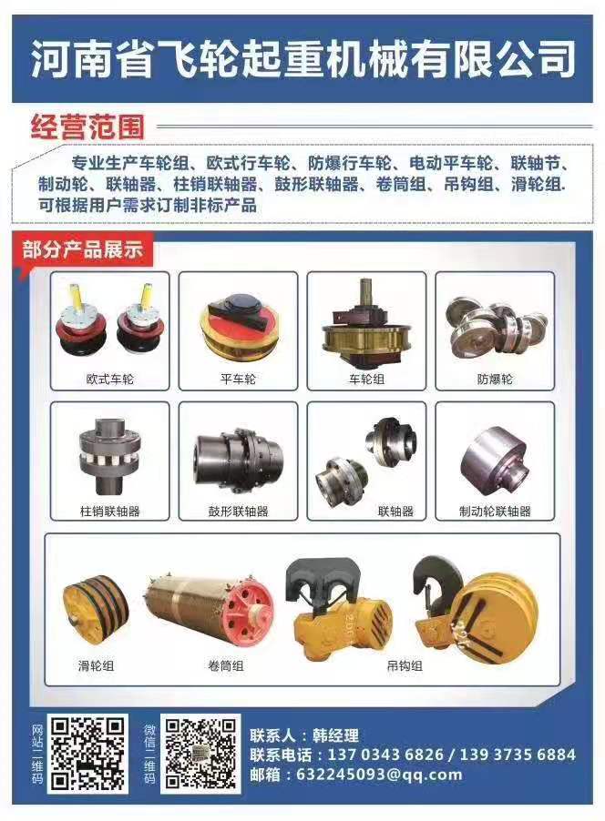 联系热线:河南省飞轮起重机械有限公司,专业生产车轮组|欧式车轮组|防爆行车轮|电动平车轮|联轴接|制动轮联轴器|柱销联轴器|鼓型联轴器|卷筒组|吊钩组|滑轮组等双梁起重产品,可根据用户需求定制双梁起重配件。 选择飞轮起重是正确的选择,我们期待与您达成合作!