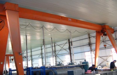 它的金属结构像门形框架,承载主梁下安装两条支脚,可以直接在地面的轨道上行走,主梁两端可以具有外伸悬臂梁