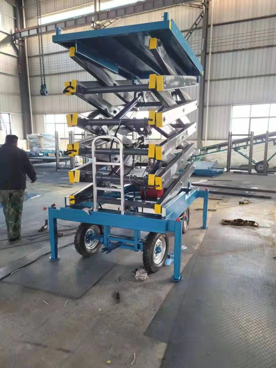 升降平台升降平台是一种多功能起重装卸机械设备。升降平台升降系统,是靠液压驱动。它使高空作业效率更高,安全更保障??煞治潭ㄊ胶鸵贫?。我公司的升降平台品种多,样式多,具有重量轻、自行走、电启动、自支腿、操作简单、作业面大,能跨越障碍进行高空作业等360度自由旋转优点。