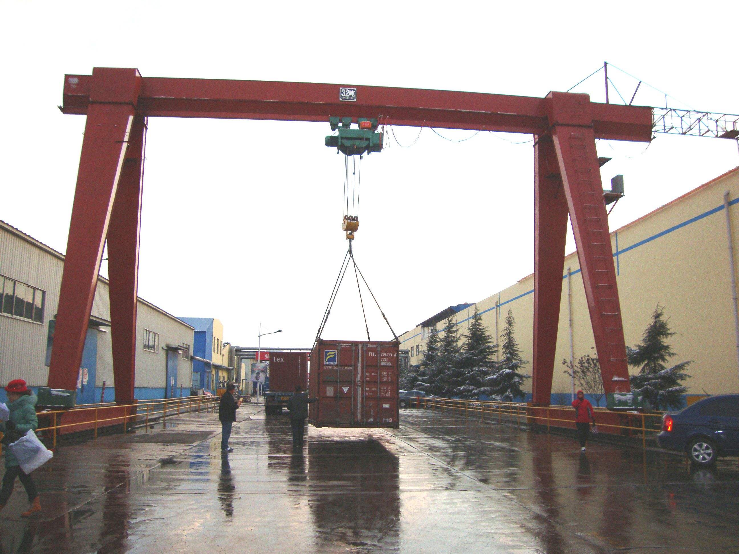 门式起重机桥式起重机的一种变形,又叫龙门吊。主要用于室外的货场、料场货、散货的装卸作业。它的金属结构像门形框架,承载主梁下安装两条支脚,可以直接在地面的轨道上行走,主梁两端可以具有外伸悬臂梁。门式起重机具有场地利用率高、作业范围大、适应面广、通用性强等特点,在港口货场得到广泛使用。